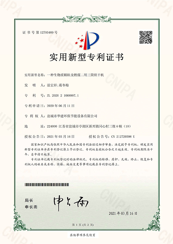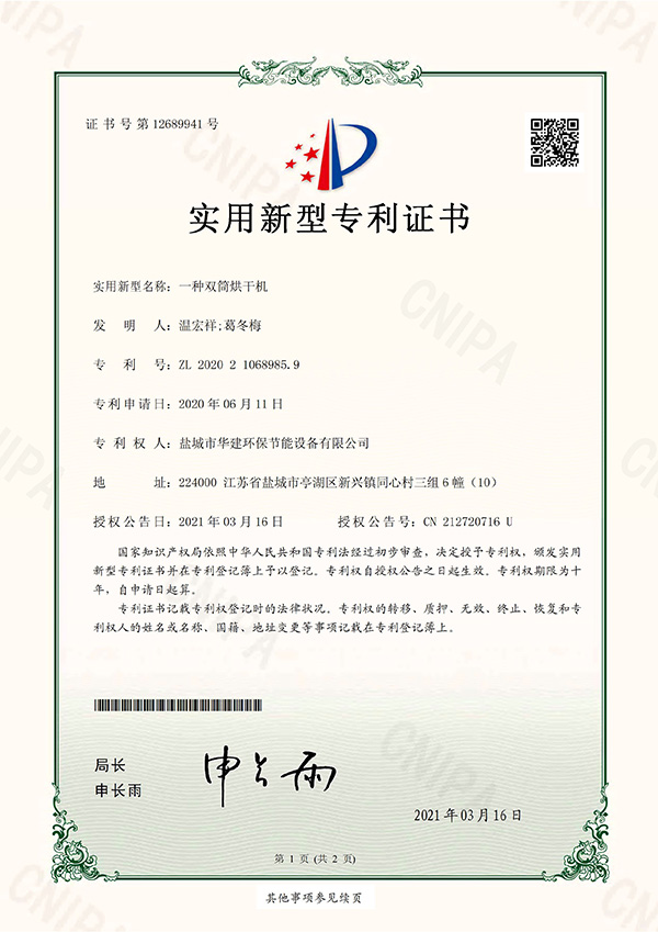 一種雙筒烘干機(jī)-實(shí)用新型專(zhuān)利證書(shū)