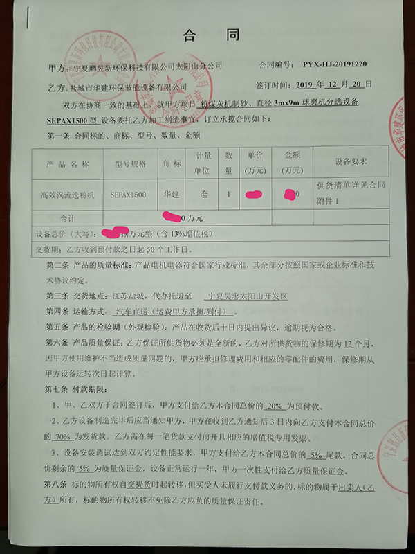 我司三年后與老客戶寧夏鵬昱新環(huán)保科技有限公司再次合作我司新型高效渦流選粉機SEPAX1500型,配套直徑3.0米球磨機使用。